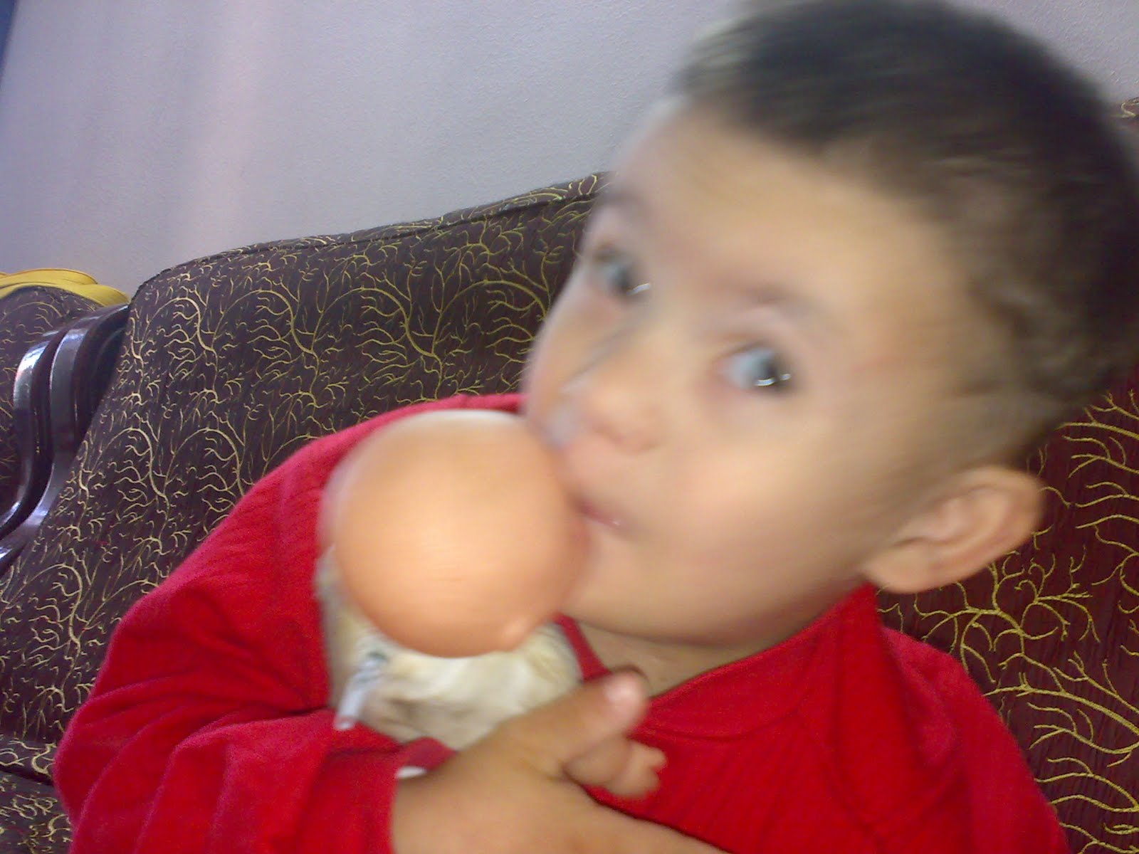 [warning]شوفي[/warning]محمود خفاها باحضانه هذة القرعه هي هديه من بنت عمته علياء قمورة وللاسف بدون ملابس بس مواهبها كثير بها زر نضغط عليه تتكلم بصوت حلو ومحمود متعاطف معها لانها قرعه يمكن؟